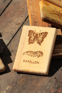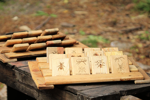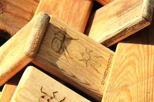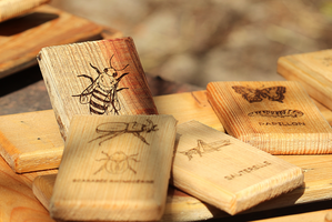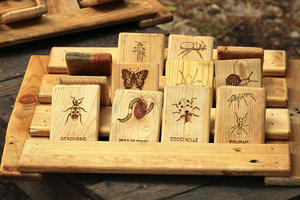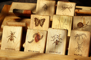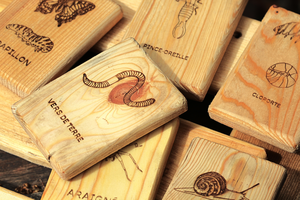 - 24 plaquettes en bois gravées de motifs d'insectes et petits arthropodes